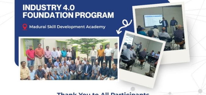We successfully conducted the Industry 4.0 Foundation Program at Madurai Skill Development Academy, empowering professionals from various industries with hands-on knowledge in smart manufacturing, digital transformation, industrial automation, and Industry 4.0 technologies.